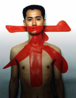 Beijing, China"In dieser Arbeit wurde ein rotes chinesisches Schriftzeichen, das 'Nein!' bedeutet, auf den Körper und die Wand gemalt. Es überdeckt die Verbindung von Körper und Wand. Die Illusion dient hier der Diskussion der Beziehung von Bild und Hintergrund -