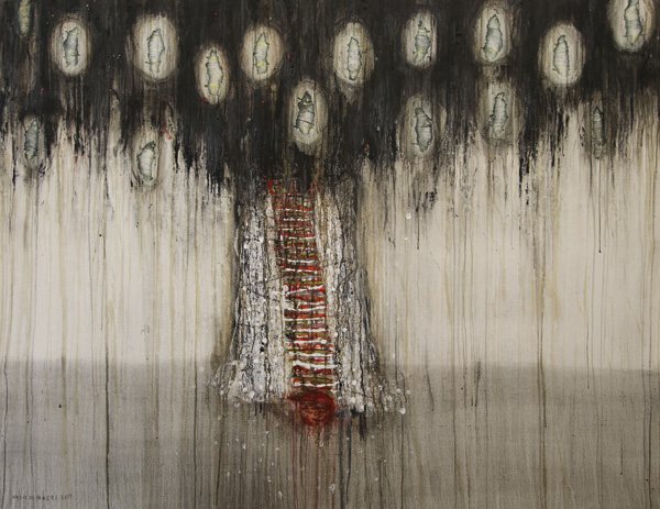Walid El Masri’s artistic practice begins with a keen examination of a single material subject which is revealed in the spatial and textural explorations of his Symbolist abstracted paintings. These subjects have include such things as a chair, a tree, etc. In his recent body of work the artist has observed movement and vibration as encapsulated in the life cycle of a butterfly cocoon, the dramatic transition of which alludes to a representation of Syria in its current state.